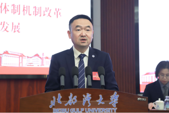 苗剑作学校年度工作报告。他表示,2024年全体师生干部职工坚持以习近平新时代中国特色社会主义思想为指导,深入贯彻落实习近平总书记关于广西工作论述的重要要求和关于教育的重要论述及全国、全区教育大会精神,从海洋强国建设和广西“一区两地一园一通道”建设大局出发,坚定贯彻落实自治区决策部署,认真落实立德树人根本任务,学校取得了较好的工作成绩,交出了有质量、有分量的发展答卷。他从学校改革发展、党建及师生思想政治教育、教育教学成果、科研平台建设、国际国内交流合作、服务保障体系等方面对2024年以来的学校工作进行了全面回顾总结。